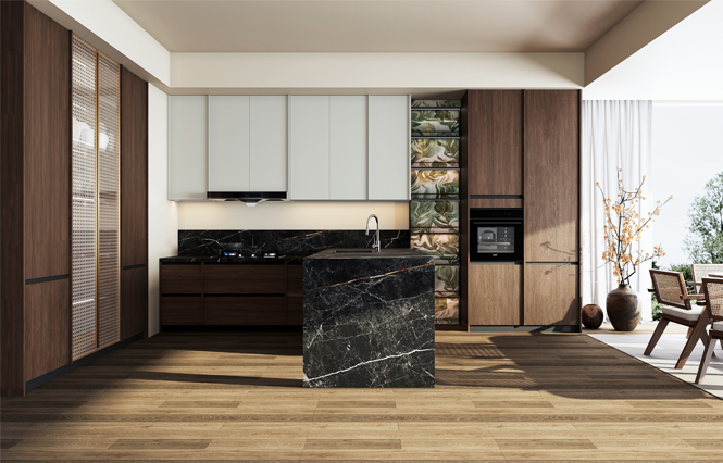 通過凱發天生一觸即發廚柜量體裁柜,定制出適合主廚下廚的烹飪區和洗滌區的舒適高度。
